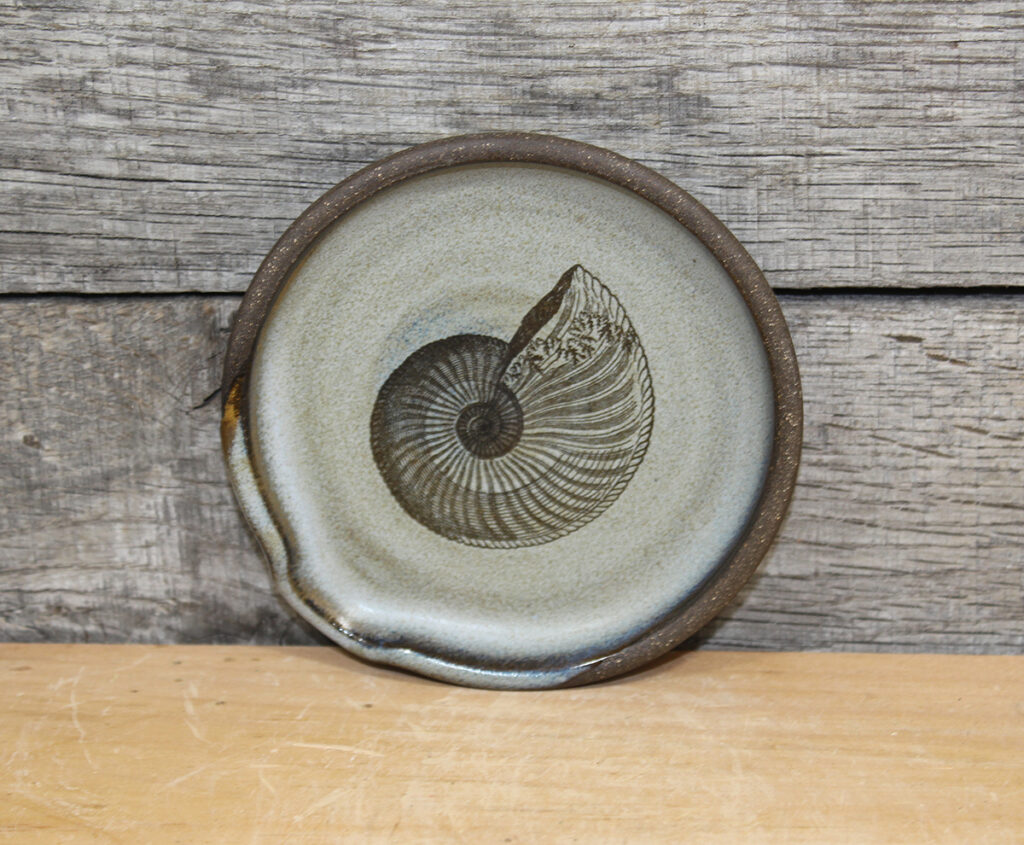 This blue spoon rest has an ammonite engraved into the surface. Would also work well as a small soap dish.